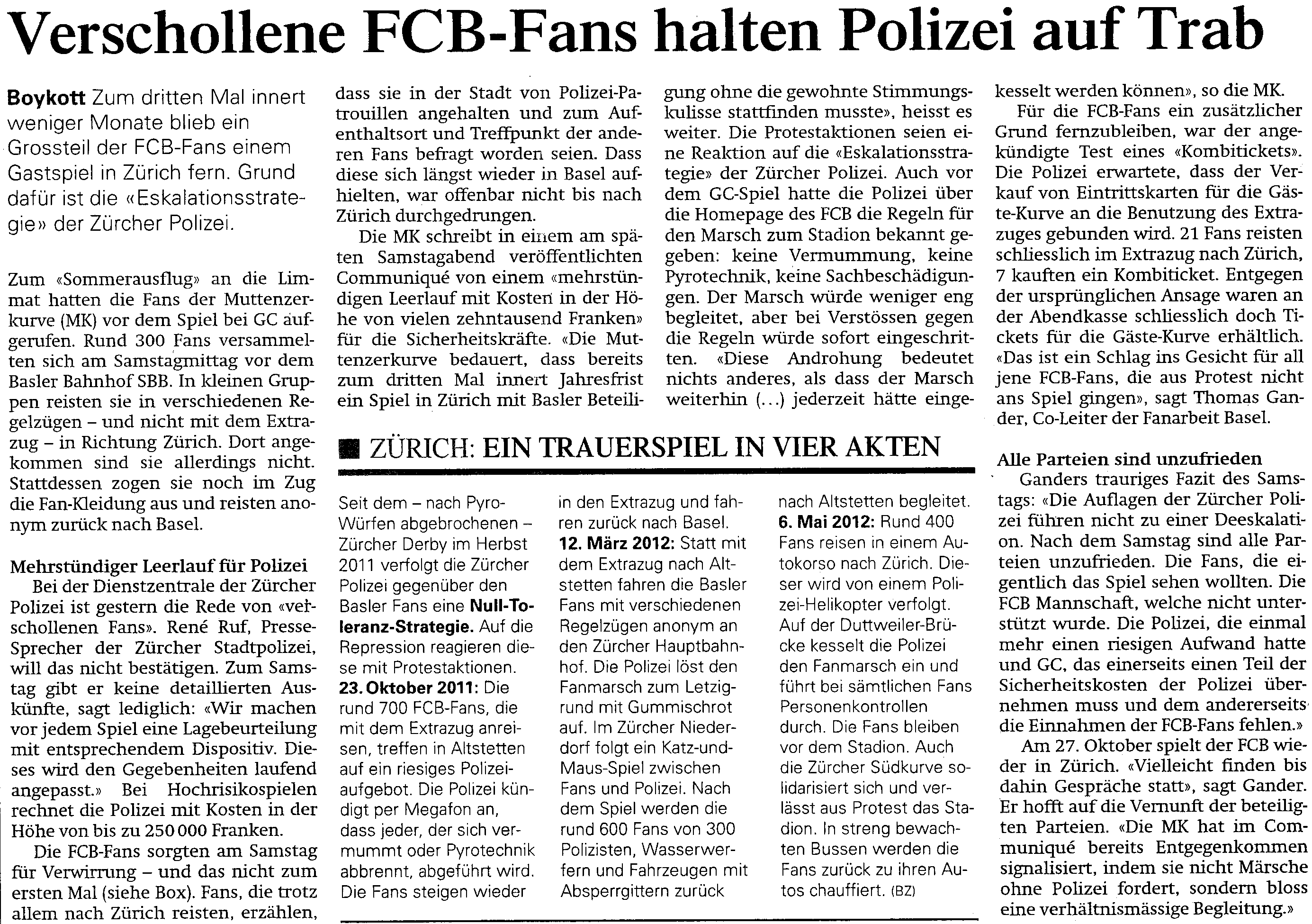 - Das vorgeschlagene Gesetz wird zur Durchsetzung eine Unmenge an Sicherheitskräften benötigen und Gegenreaktionen auslösen oder zu unschönen Szenen auf Bahnsteigen führen. Die Stadtpolizei Zürich hat vor Kurzem Kombi-Tickets ohne Rechtsgrundlage getestet (siehe «Verschollene FCB-Fans halten Polizei auf Trab»).
